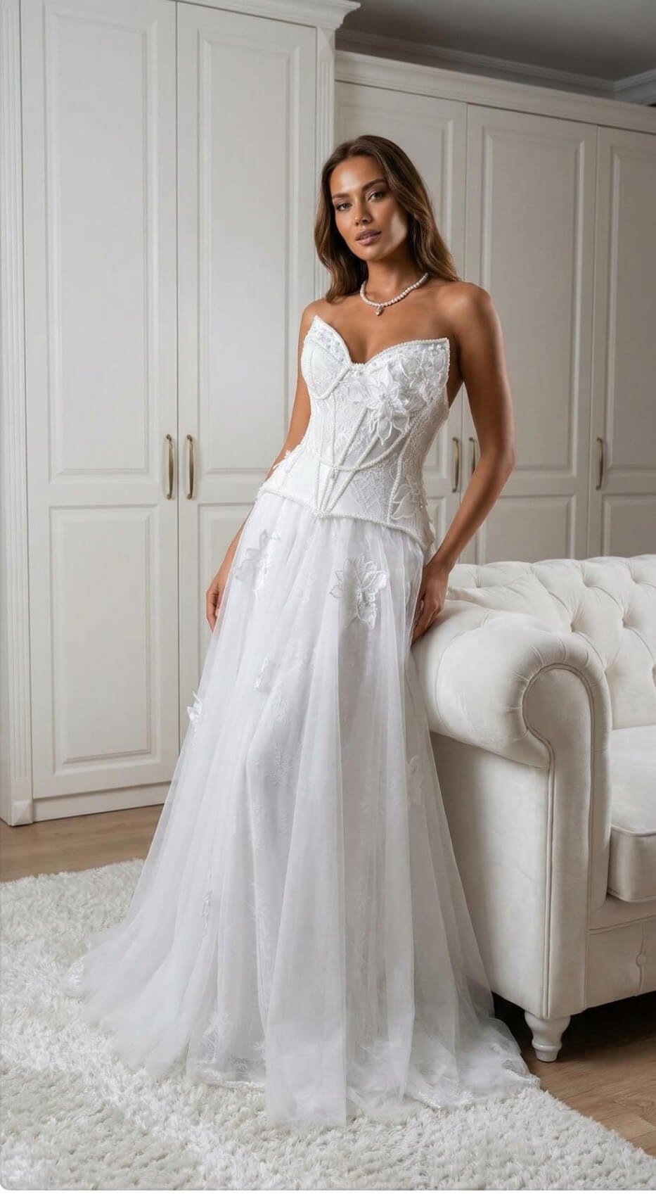 Edele, eenvoudige en elegante Helen trouwjurk met gelaagde tule rok, Helen model trouwjurk met korset model, kattenoor kraag en parel details op de borst deel