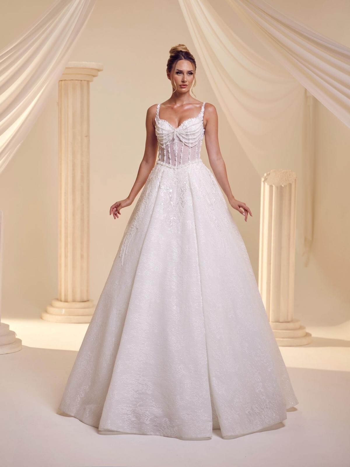 Deze A-lijn trouwjurk met prachtig handwerk en pareldetails op de borstdetails is een stijlvolle A-lijn trouwjurk die mooi op de taille zit met zijn dunne bandjes, hartvormige halslijn en V-uitgesneden taille model.