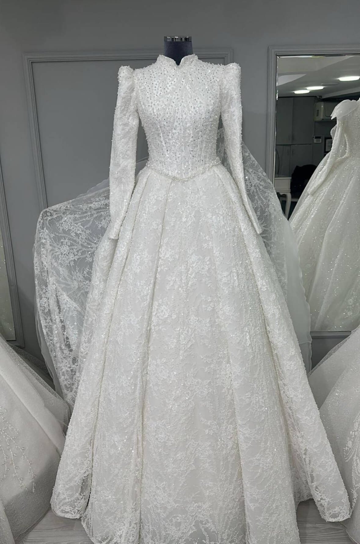 Kanten elegantie in Hijab A Cut Vorm in de vorm van A Cut Taille Deel V Cut Zittend op de Taille, Kraag Splitjes en Puffy Mouwen Detail Prachtige Hijab Trouwjurk